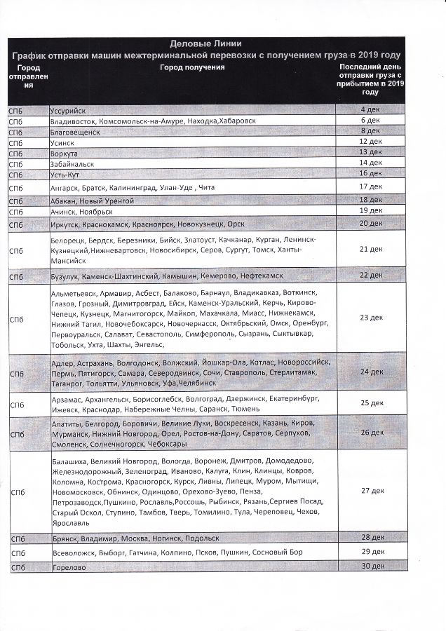 Уважаемы клиенты, обращаем Ваше внимание на крайние числа отправки грузов ТК Деловые линии из Санкт-Петербурга в 2019 году.